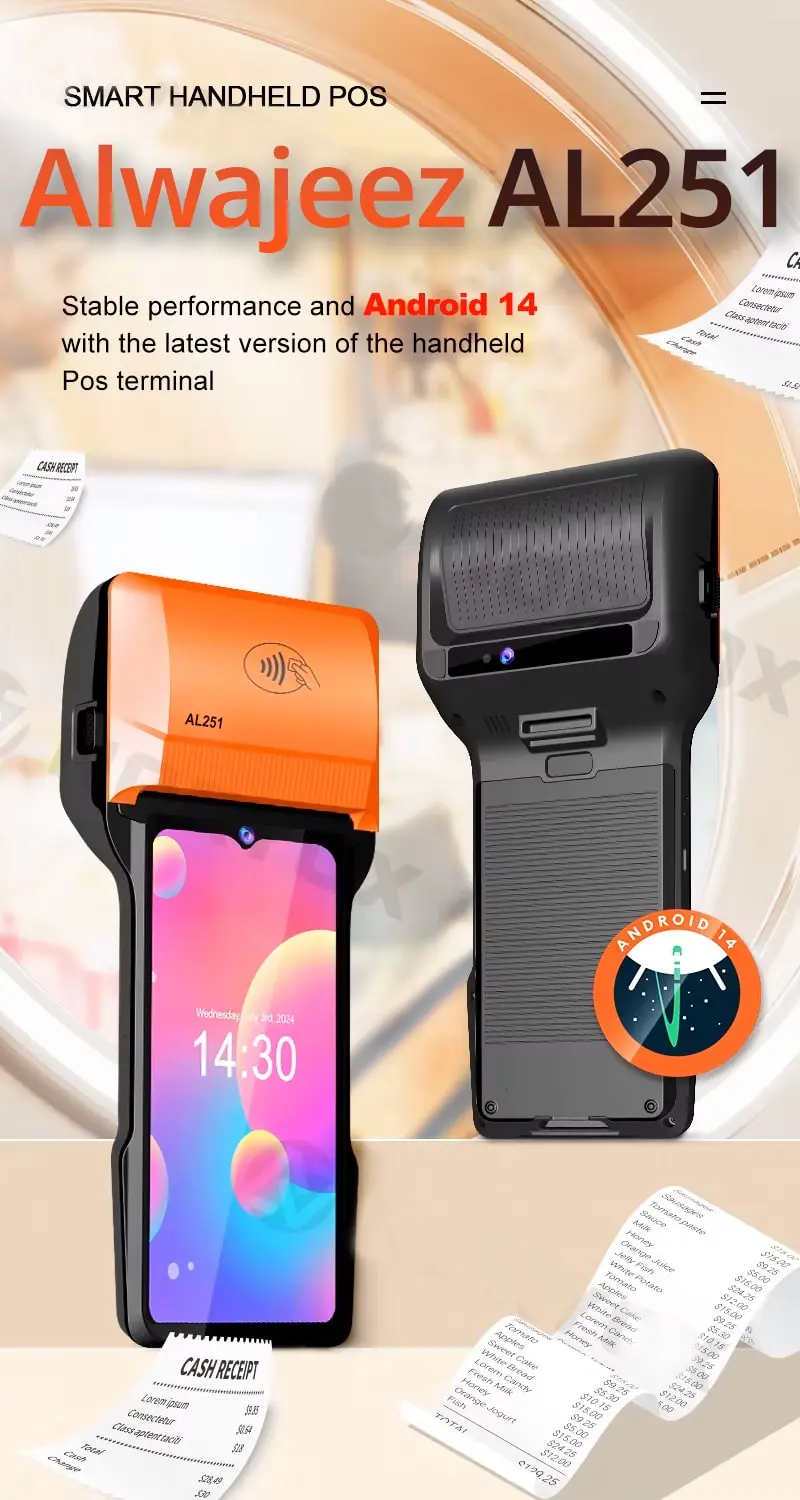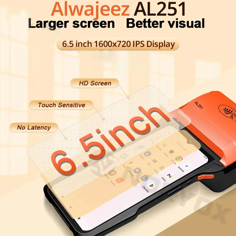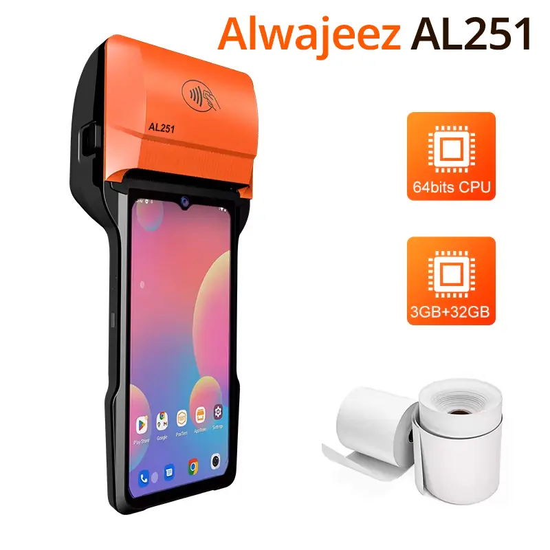 The Alwajeez AL251 is a 6.5″ Android 14 All-in-One Mobile POS Terminal designed for modern, fast-paced retail, F&B, and mobile sales operations. It features a high-speed thermal printer, integrated NFC, dual SIM slots, and support for ALZPOS 1.01, a KSA ZATCA-compliant invoicing and inventory management app. Engineered with the latest Android OS and powerful hardware, the AL251 is a game-changer for small to mid-sized businesses in Saudi Arabia and across the GCC region.