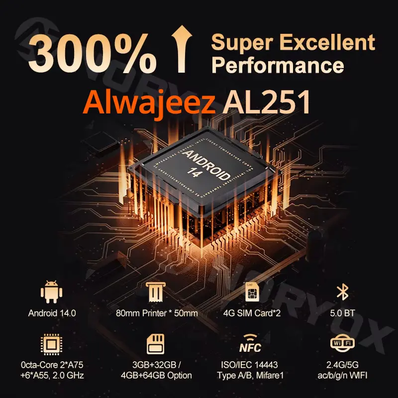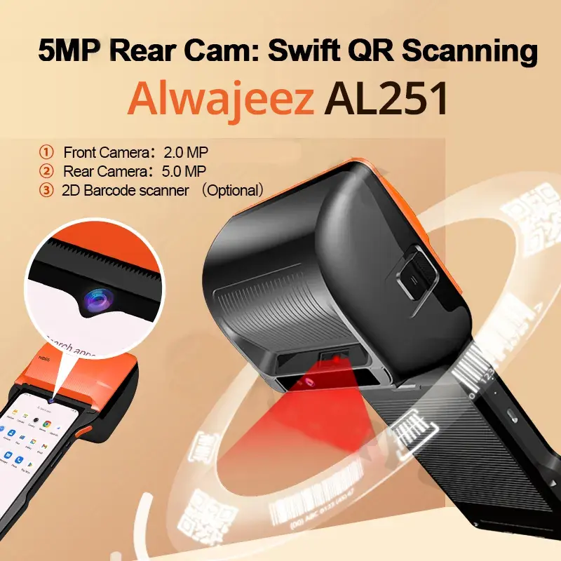 The Alwajeez AL251 is a versatile, Android 14-based POS terminal combining a thermal printer, NFC reader, barcode scanner (optional), and dual SIM slots for seamless connectivity. Its T606 octa-core processor (2.0GHz) and 3GB RAM ensure smooth multitasking, while 5G WiFi, Bluetooth 5.0, and GPS enhance mobility. The 6400mAh battery supports all-day operations, and the 80mm printer delivers ZATCA-compliant QR receipts—critical for Saudi tax regulations.