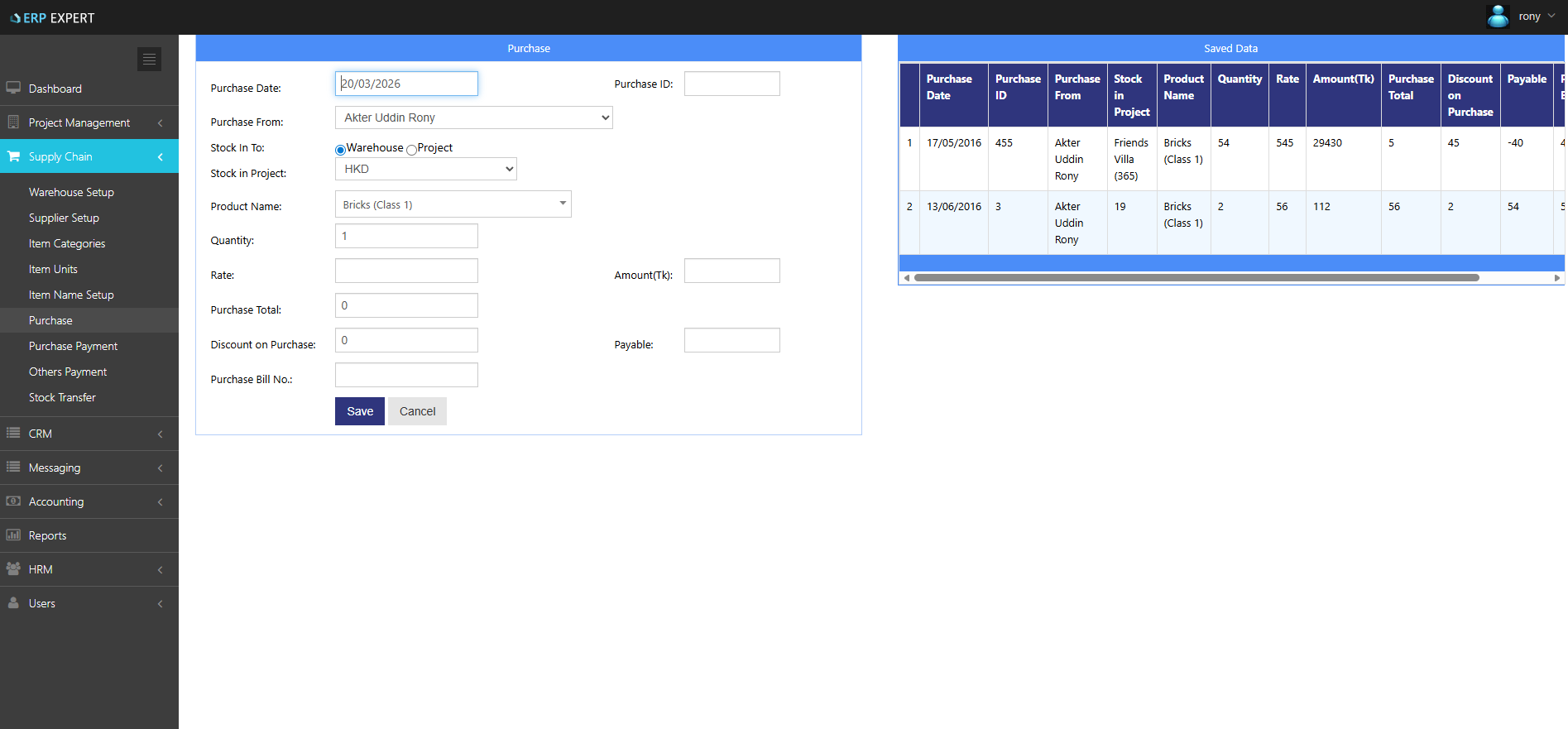 Real estate projects consume materials. ERP EXPERT gives your procurement team the tools to manage it: configure warehouses, register suppliers, categorize items, process purchase orders, handle purchase payments, manage miscellaneous payments, and track stock transfers between sites.