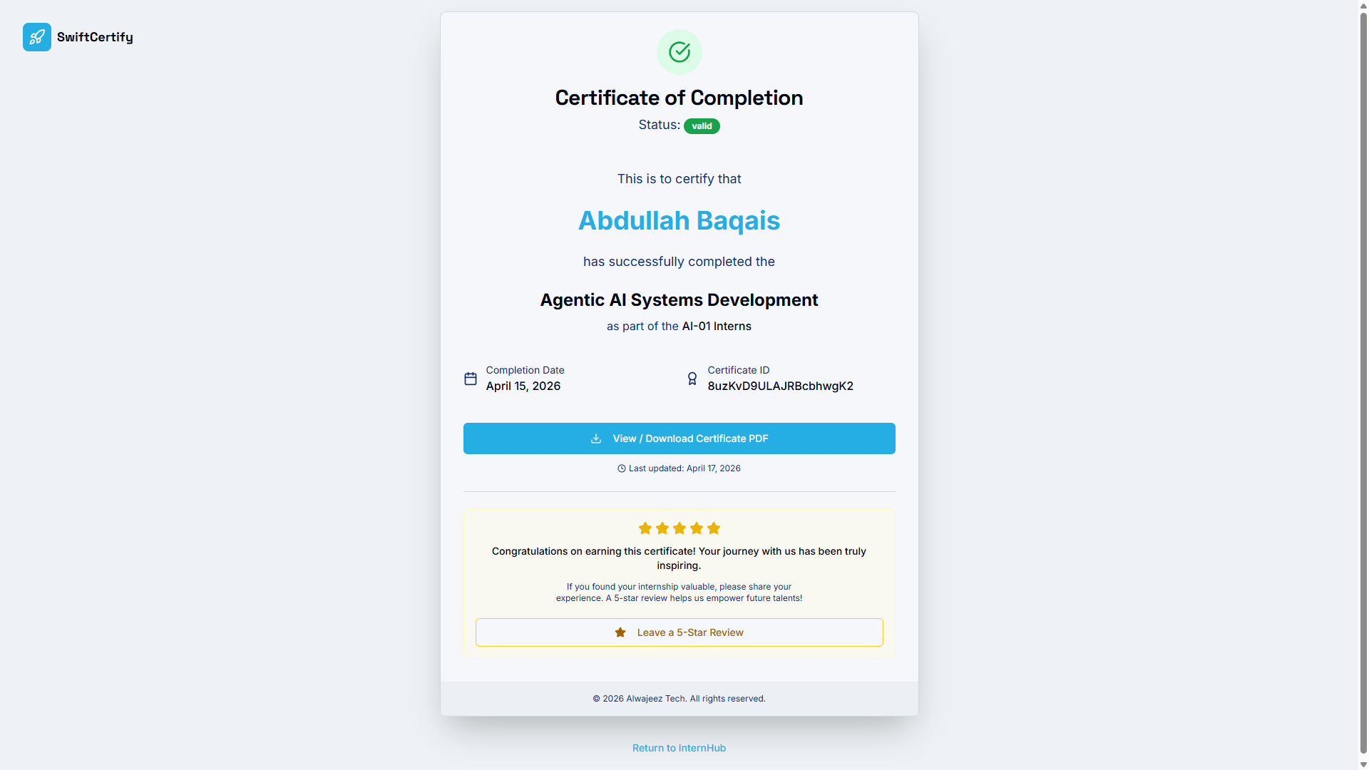 Modern organizations deserve better than credential platforms that hold their data hostage. SwiftCertify is a powerful online certificate manager that puts you in the driver’s seat — automating certificate issuance, tracking professional achievements, and managing enterprise credentials entirely on your own infrastructure. Whether you run an HR department, a corporate training programme, or an educational institution, SwiftCertify by Alwajeez Tech eliminates administrative overhead and replaces it with a seamless, verifiable, and scalable credentialing system.