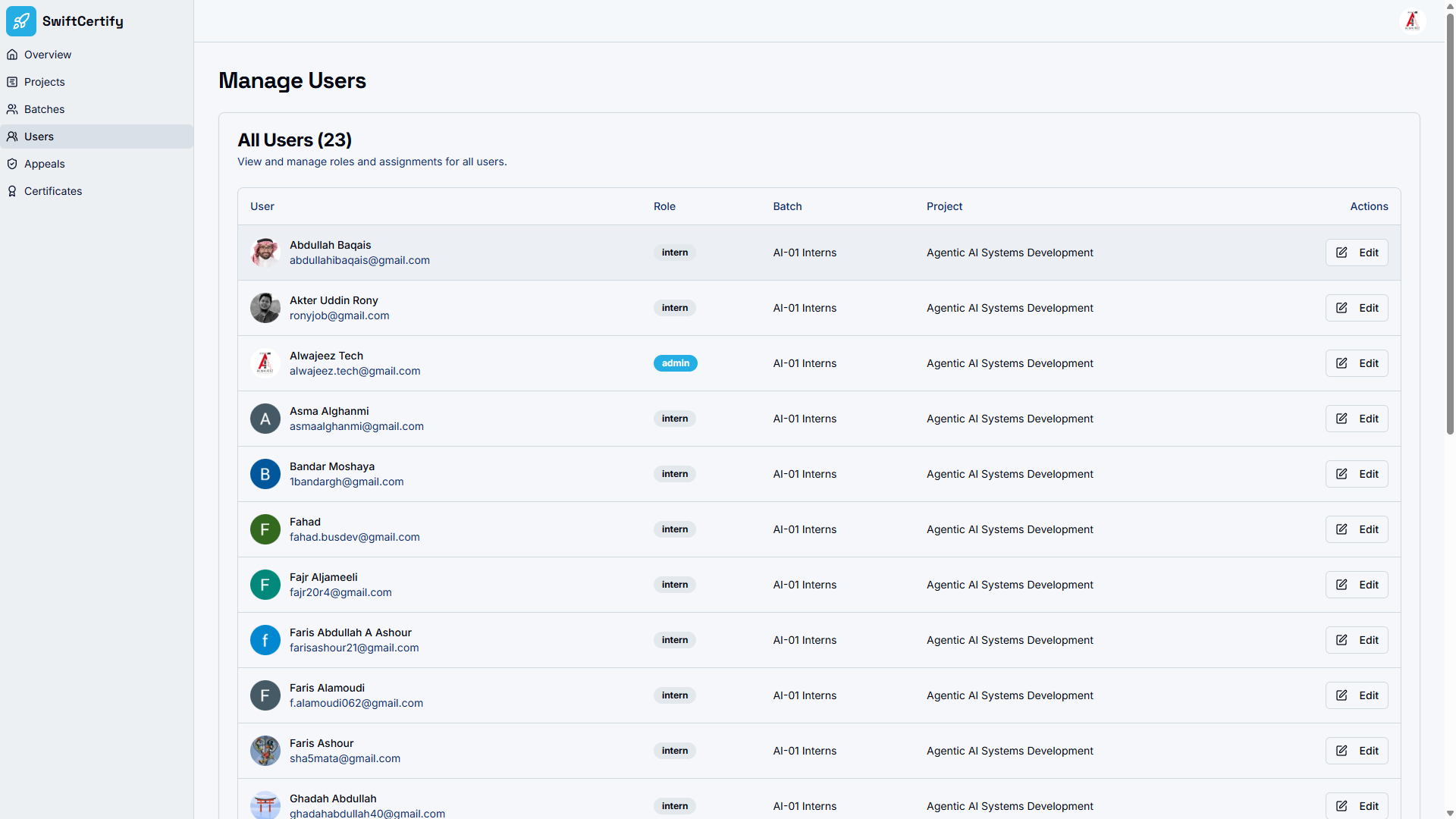 Log into the SwiftCertify admin dashboard and define your programme (e.g., “Advanced AI Engineering”) and batch (e.g., “Batch 4”). Then generate a unique self-enrollment link and share it with your participants — they click the link, submit their details, and are automatically onboarded into the correct cohort. No manual imports required.