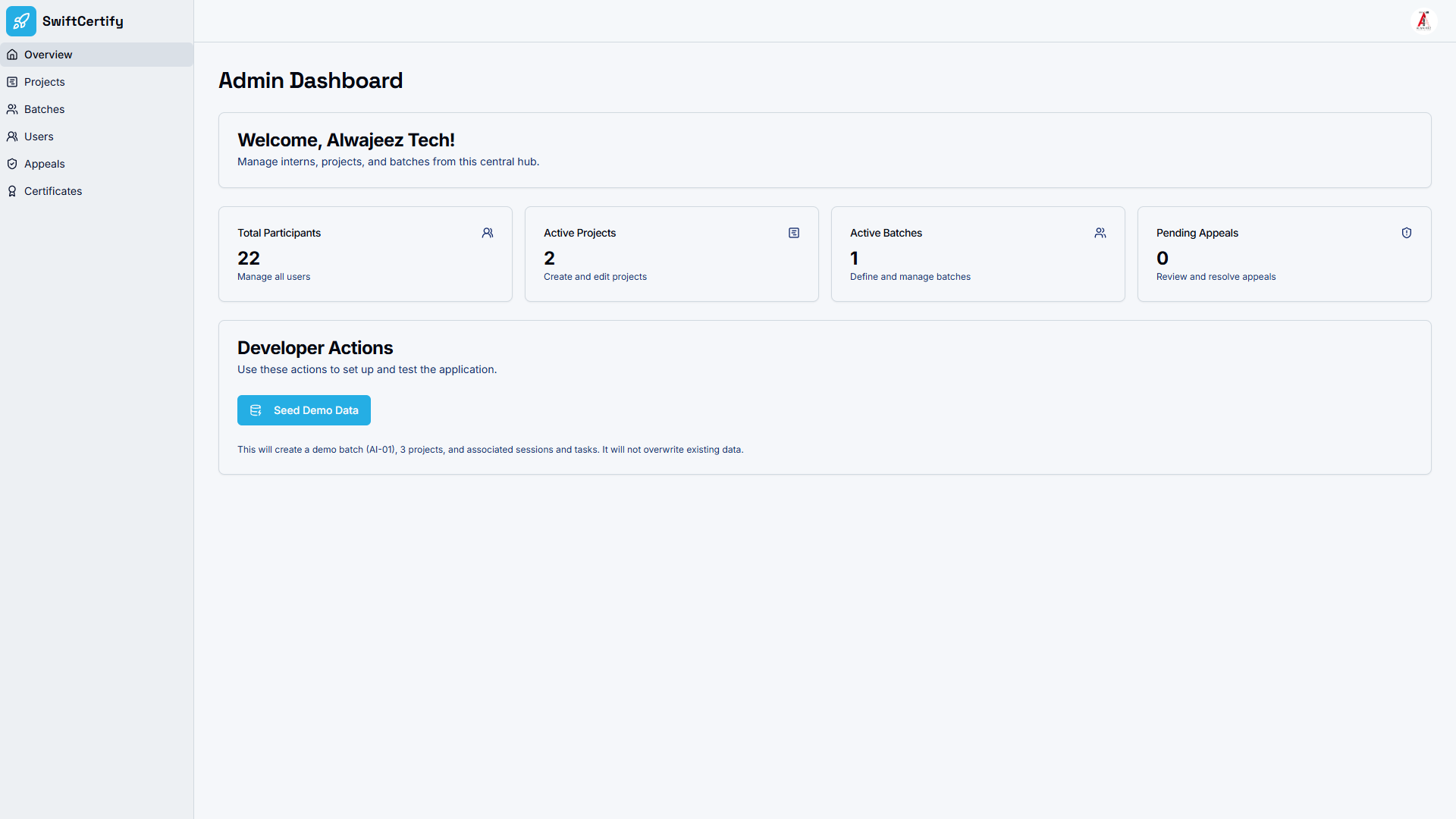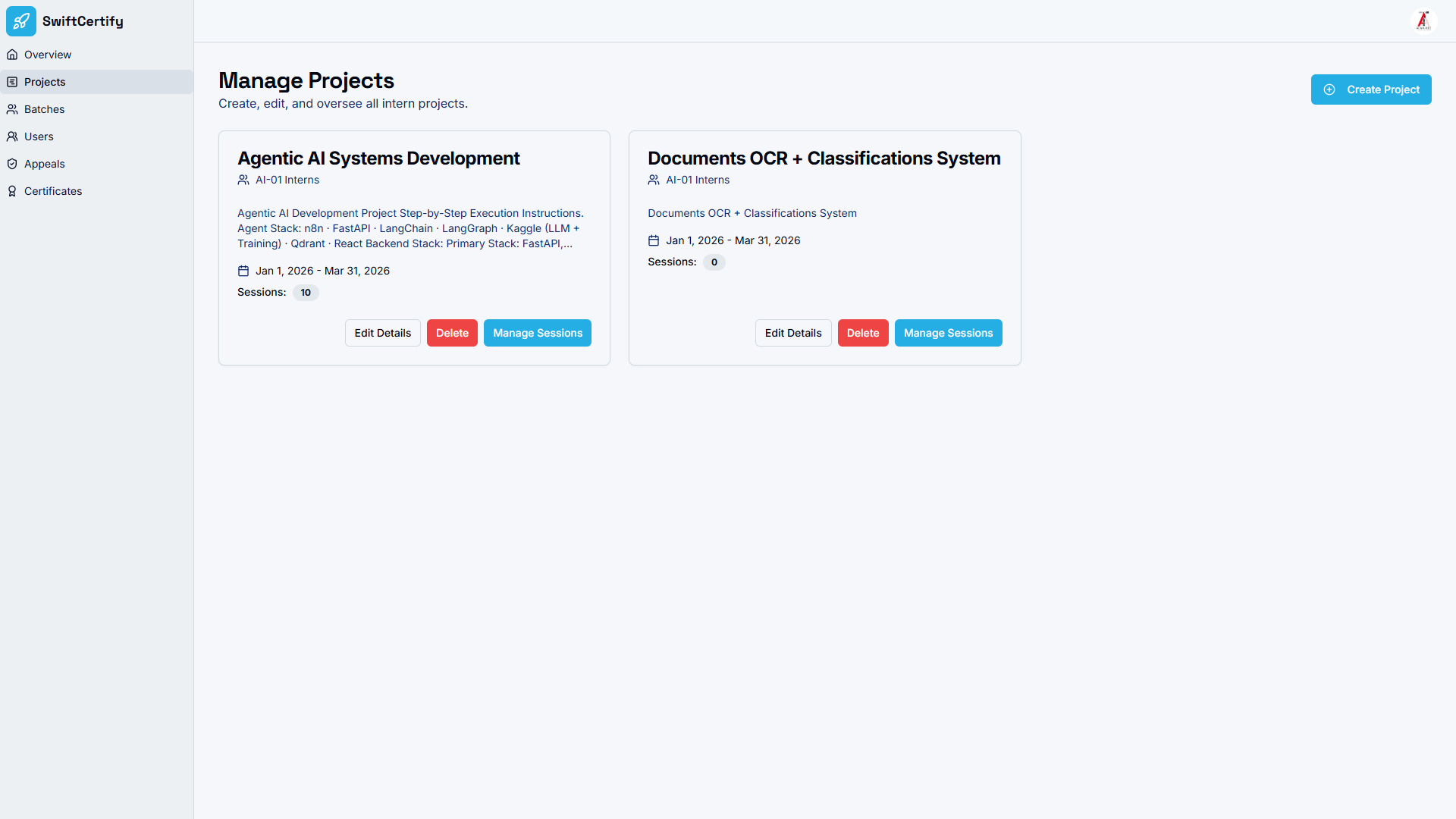 Streamline onboarding and training programmes end-to-end. SwiftCertify allows managers to set up programmes and cohort batches, assign real-world projects, schedule sessions, review participant progress, and issue verifiable certificates — all from a single comprehensive admin dashboard. Professional achievement tracking has never been more effortless.