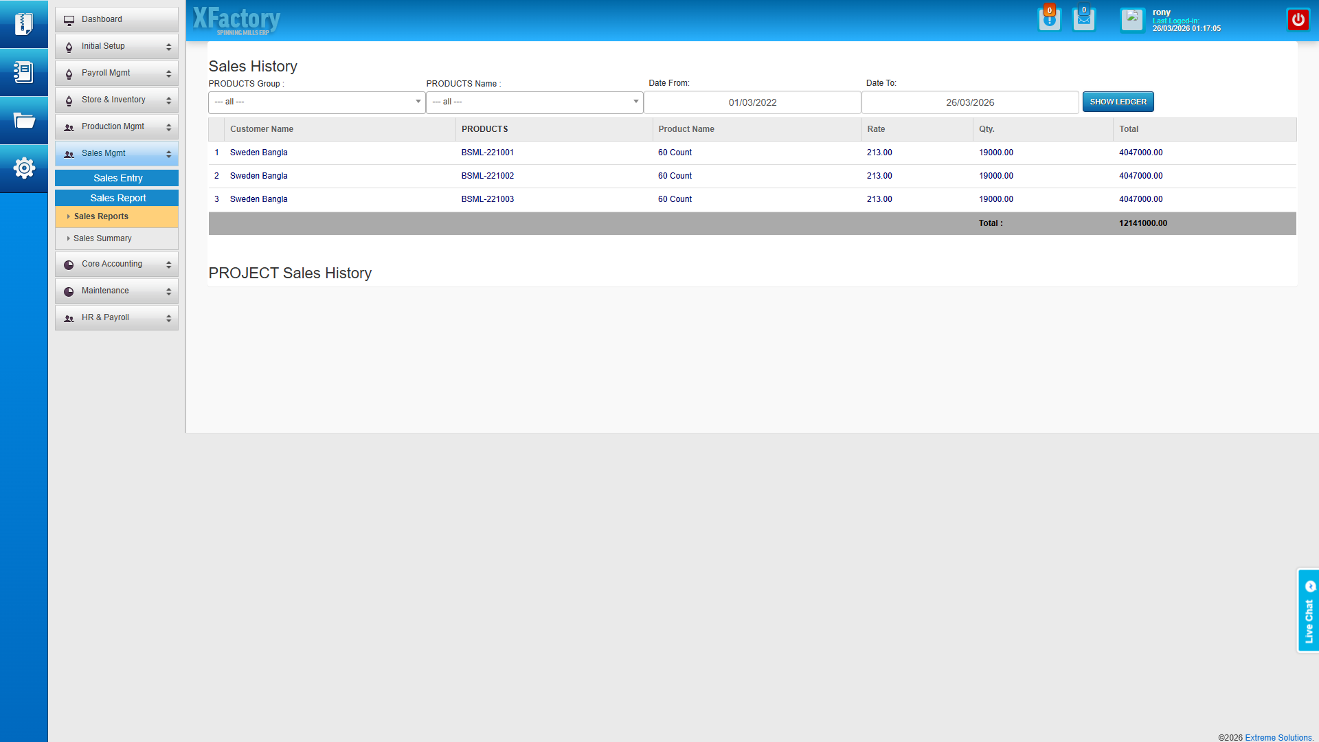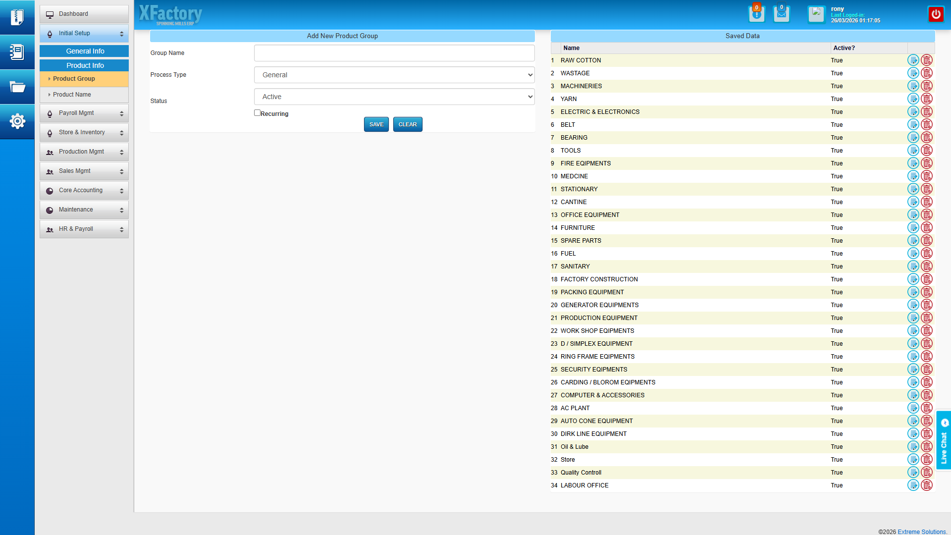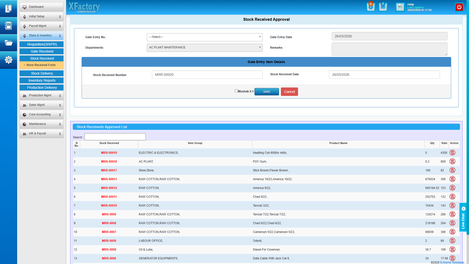 The demo environment is the exact system you receive upon purchase — no feature restrictions, no placeholder data. Log in and explore every module: cotton bale receipts, production scheduling, quality reports, salary processing, financial statements, and the complete security administration panel.