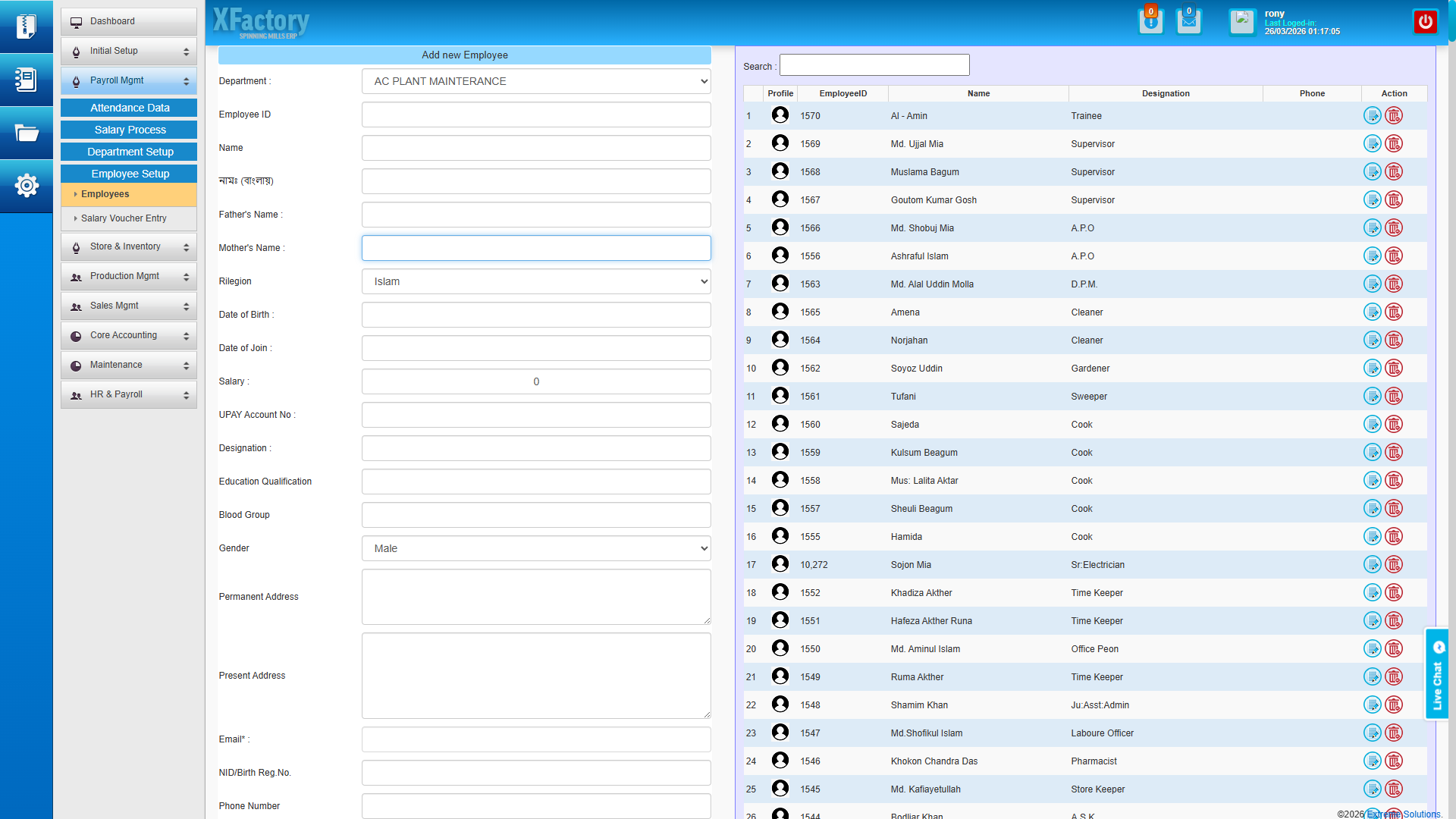 - Employee master records with department and salary grade — maintain a single, accurate record for every mill worker — loom operators, technicians, and managers alike — including personal data, job history, documents, and salary components.