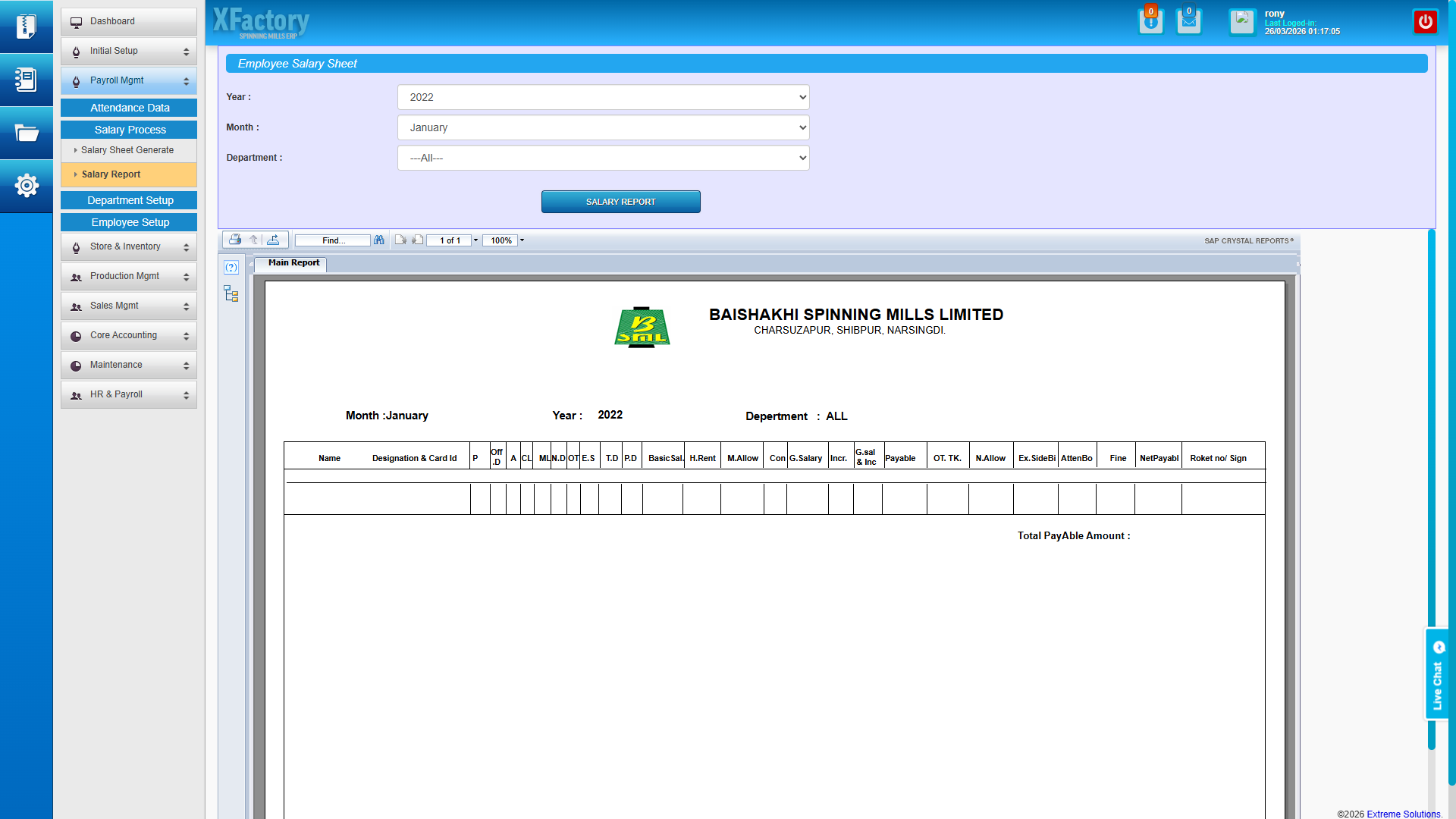 - Monthly attendance and salary reports — Crystal Reports-powered HR reports cover attendance history, salary register, department headcounts, and salary budgets for any selected period.
