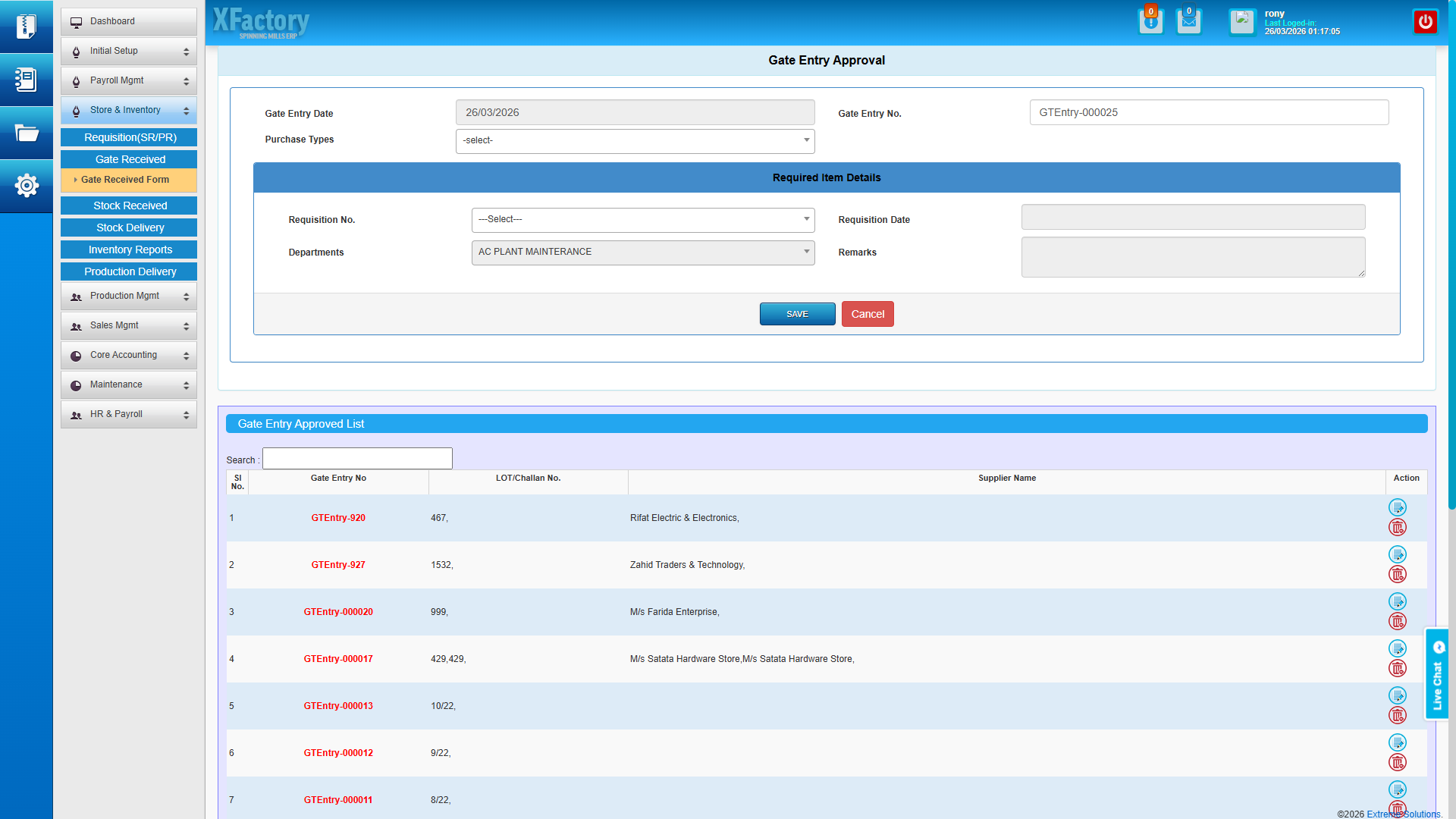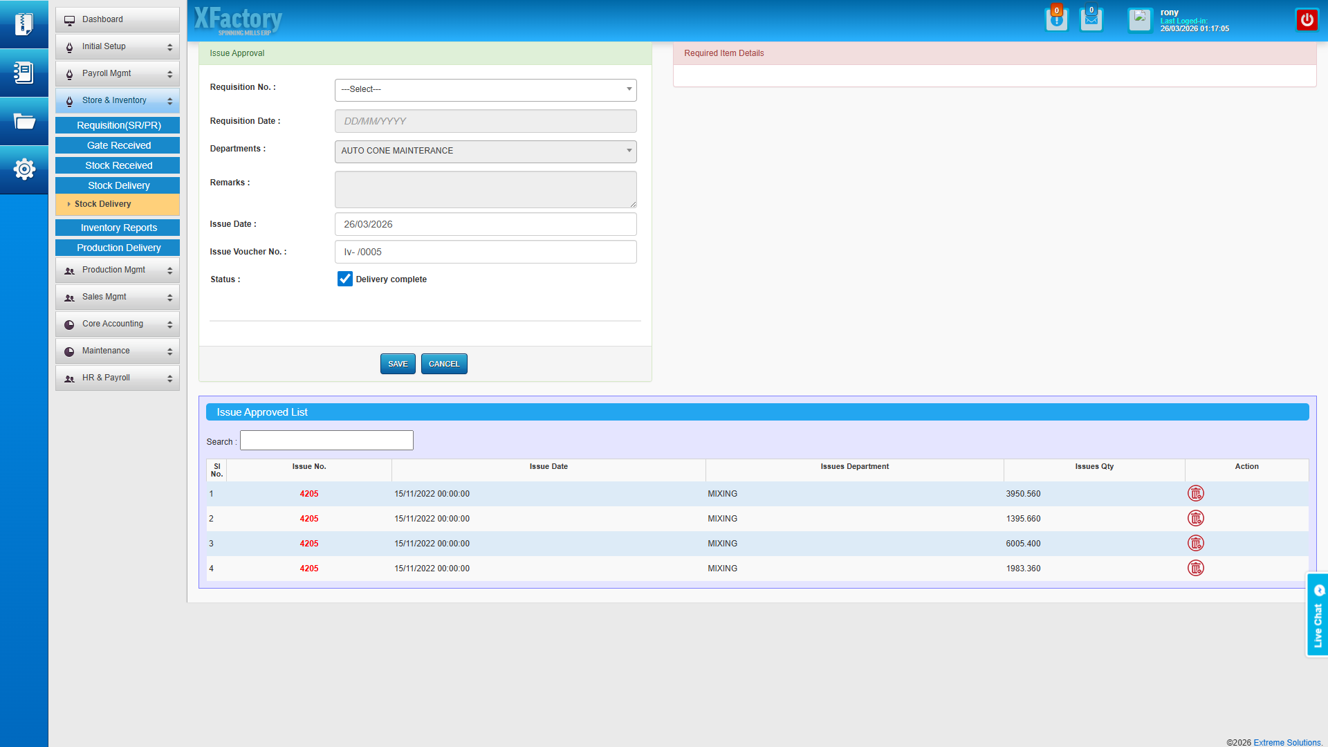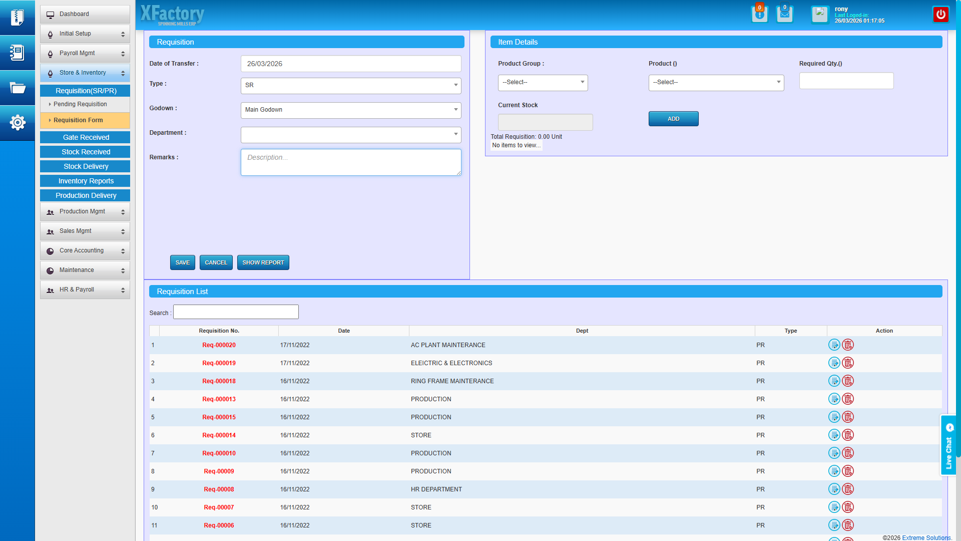 - Requisition and pending requisition management — production floor raises material requisitions digitally, which flow through an approval gate before any cotton bales leave the godown.
