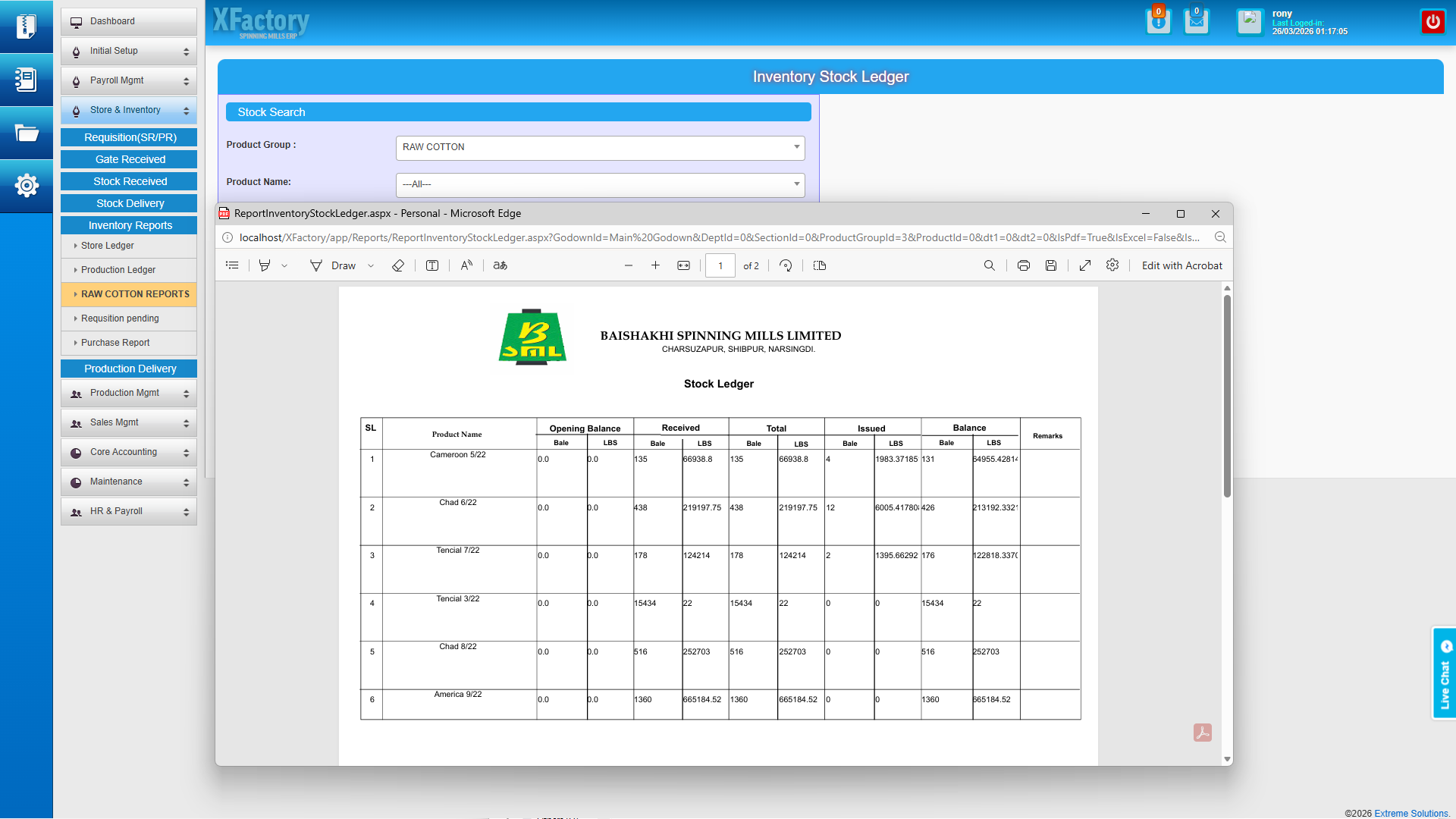 - Production ledger and raw cotton inventory reports — dedicated reporting for raw cotton consumption, current bale stock position, and production delivery history gives procurement managers the data to plan the next purchasing cycle with precision.