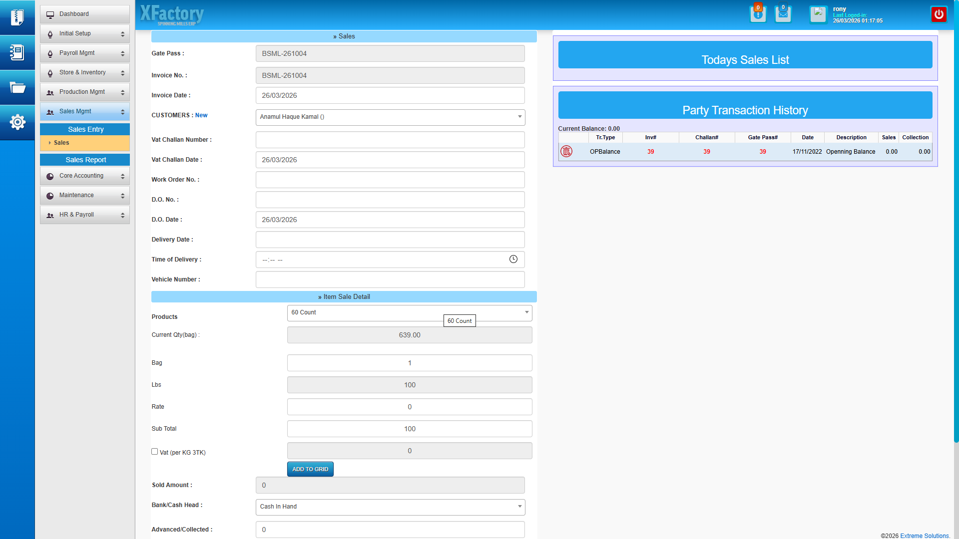 - Sales entry with customer credit limit and dues visibility — sales staff see a customer’s outstanding balance and approved credit limit at the point of order entry, preventing over-exposure before an invoice is raised.