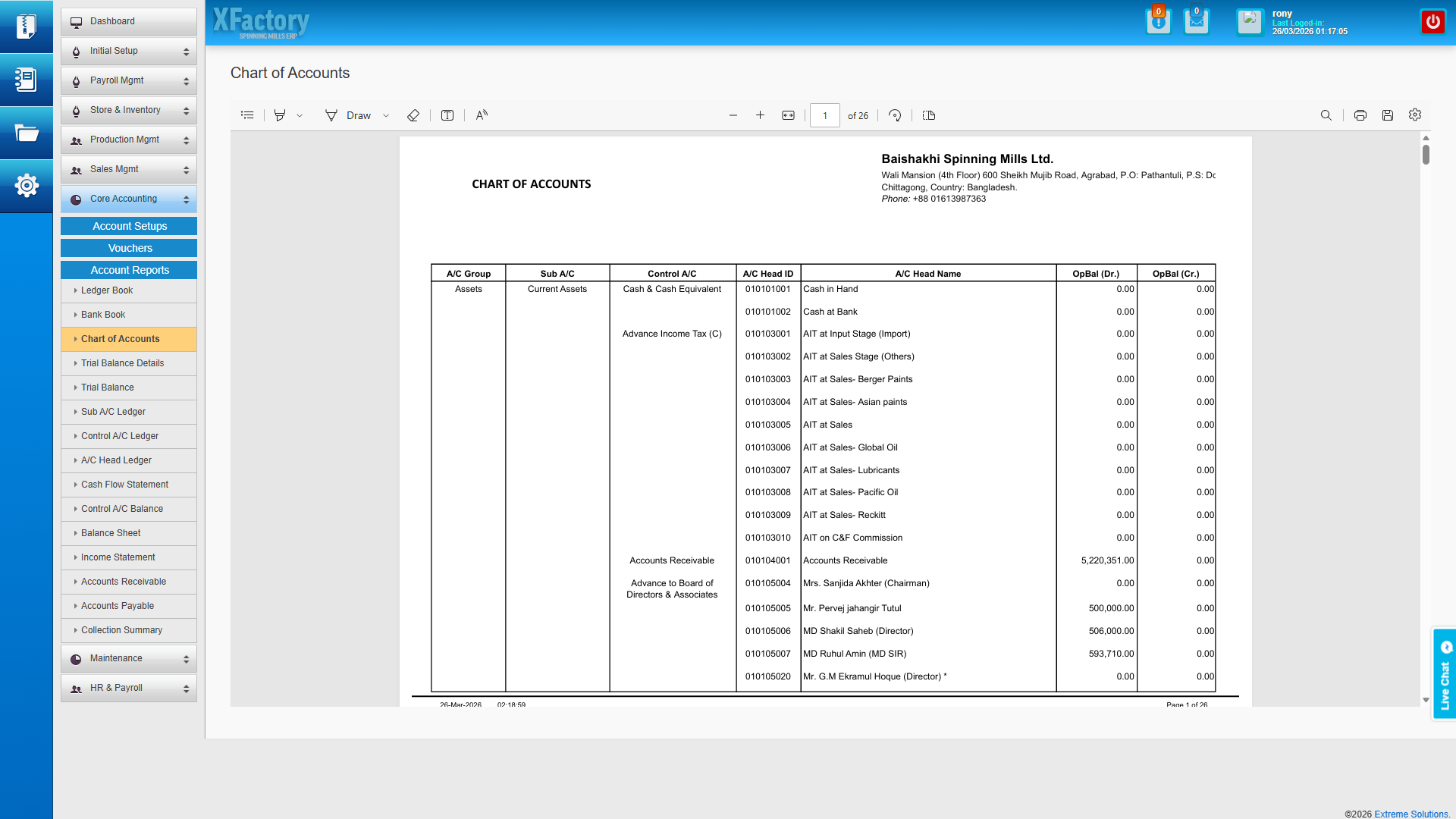 - Multi-level Chart of Accounts (Groups → Control → Ledger → Sub-Accounts) — the full double-entry accounting engine supports any account structure, with every purchase, sale, salary, and inventory movement posting automatically without manual journal entries.