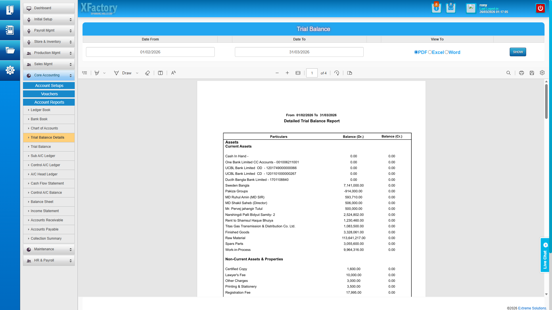- Complete financial statement suite — Balance Sheet, Income Statement, Cash Flow Statement, Trial Balance (standard and detailed), Bank Book, and full Ledger drill-down are all generated in real time directly from transaction data.